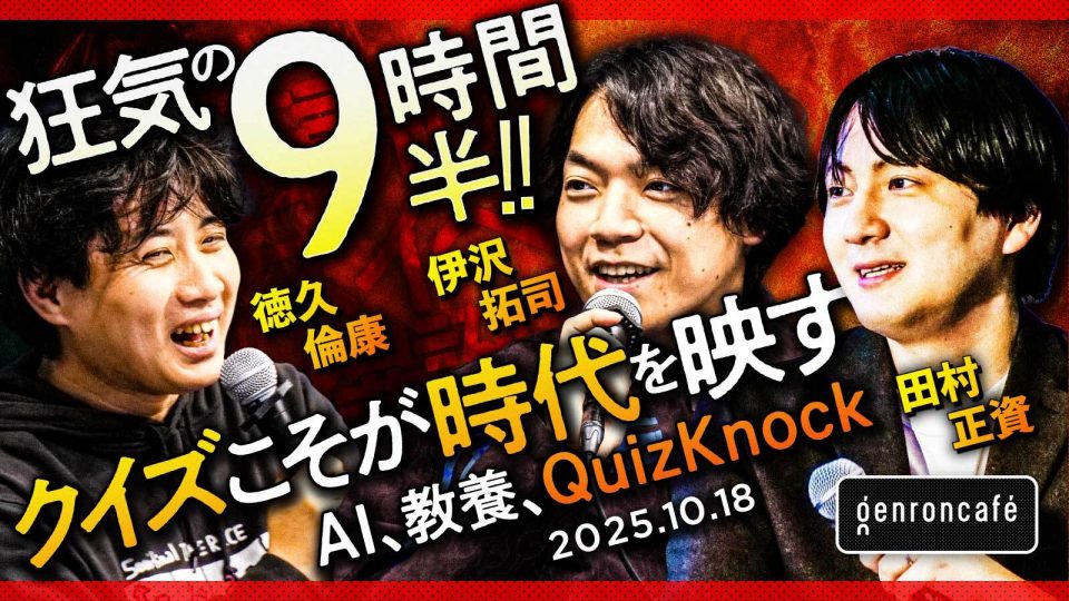 今回も伊沢さんに加え、QuizKnockの運営会社である株式会社baton所属の田村正資さん、徳久倫康さんをお招きします。田村さんは『君のクイズ』文庫版の解説を執筆。徳久さんは『日本社会をクイズで解く』をゲンロンより刊行しています。