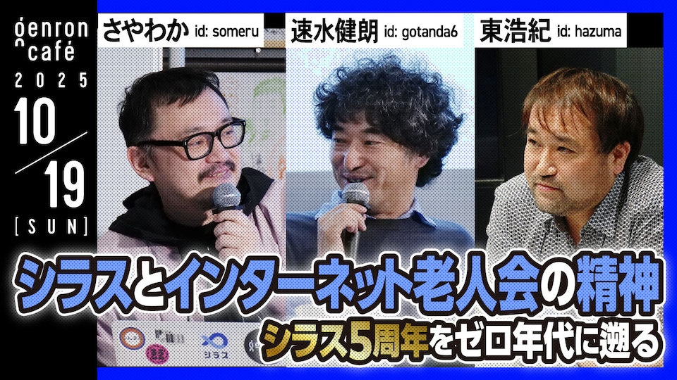 2025年10月19日、シラスは開設5周年を迎えます。このたびゲンロンでは、チャンネル「カルチャーお白洲」を開設されているさやわかさん、同じくチャンネル「あなたが手に取り損ねた本 Book Diggin」を開設されている速水健朗さんをお招きし、東浩紀が聞き手となってシラス5周年の意義を語るカルチャー批評イベントを開催します。