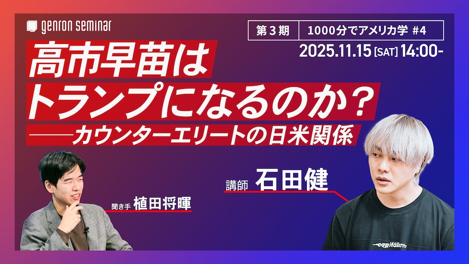 第4回 11月15日(土) 石田健 聞き手=植田将暉「高市早苗はトランプになるのか?──カウンターエリートの日米関係」
