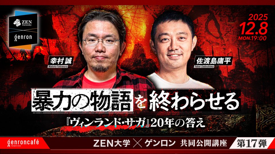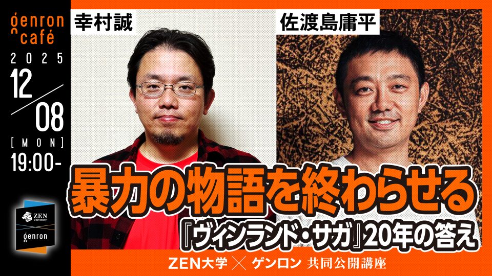 歴史大河マンガ『ヴィンランド・サガ』完結を記念して、作者の幸村誠さんとマンガ編集者の佐渡島庸平さんを招いたトークイベントです。ZEN大学とゲンロンの共同公開講座・第17弾。