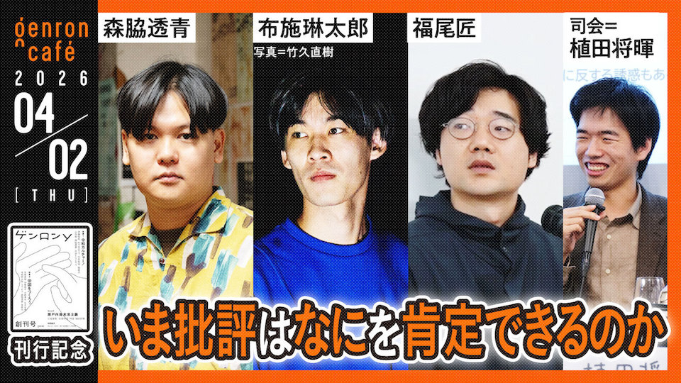批評家・哲学者の福尾匠さんをゲンロンカフェにお招きします。トークの相手は、『ゲンロンy』寄稿者でアーティストの布施琳太郎さん、そして編集委員で批評家の森脇透青さんです。司会は、編集部の植田将暉がつとめます。